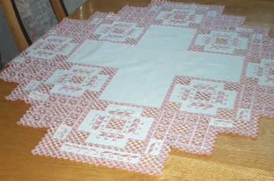 Dies ist mein Prachtstück in Hardangertechnik. Die Decke ist ca 80 x 80 cm groß und dient mir als Mitteldecke auf dem Eßtisch. Inzwischen ist zwar rosa nicht mehr unbedingt meine Lieblingsfarbe, aber trotzdem lege ich sie immer wieder gerne auf.