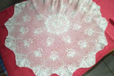 Diese Kunststrickdecke habe ich vor etlichen Jahren aus etwas dickerem Garn gestrickt, so daß der Umfang schnell größer wurde. Sie fällt dadurch auch viel schwerer. Früher lag sie immer auf einem kleinen runden alten Tischchen und hing fast bis auf die Erde runter. Zur Zeit liegt sie meist gut verwahrt im Schrank meiner Mutter. Bei einem Durchmesser von ca. 150 cm war das Stricken mit dem gesamten Gewicht sehr schwer und auch das Spannen war eine Herausforderung. Am Schluß mußte der Teppichboden im Arbeitszimmer meiner Eltern dafür herhalten.