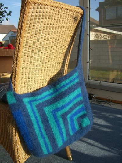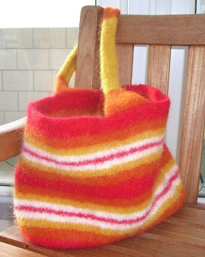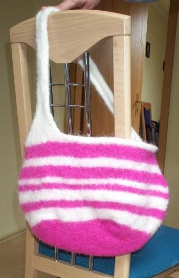 Bisher filze ich in der Version, daß ich erst stricke (zur Zeit sind das Taschen) und das Gestrickte dann mit ein wenig Waschpulver und am liebsten Handtüchern bei 60 Grad in die Waschmaschine stecke. Die Ergebnisse könnt Ihr hier sehen: